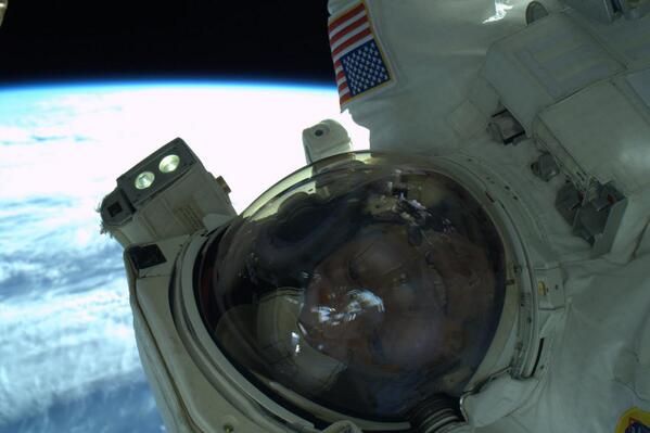 : An EVA selfie. The space suit makes it very difficult to get a good selfie. I tried several today.