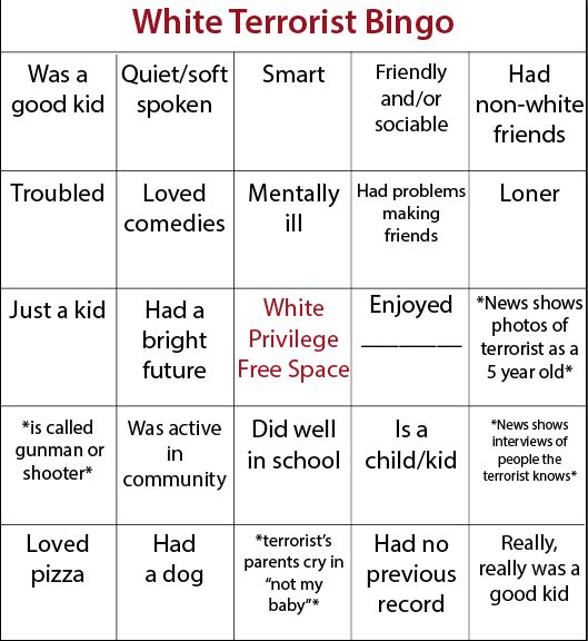 : Hey, kids! Let's play White Terrorism Bingo